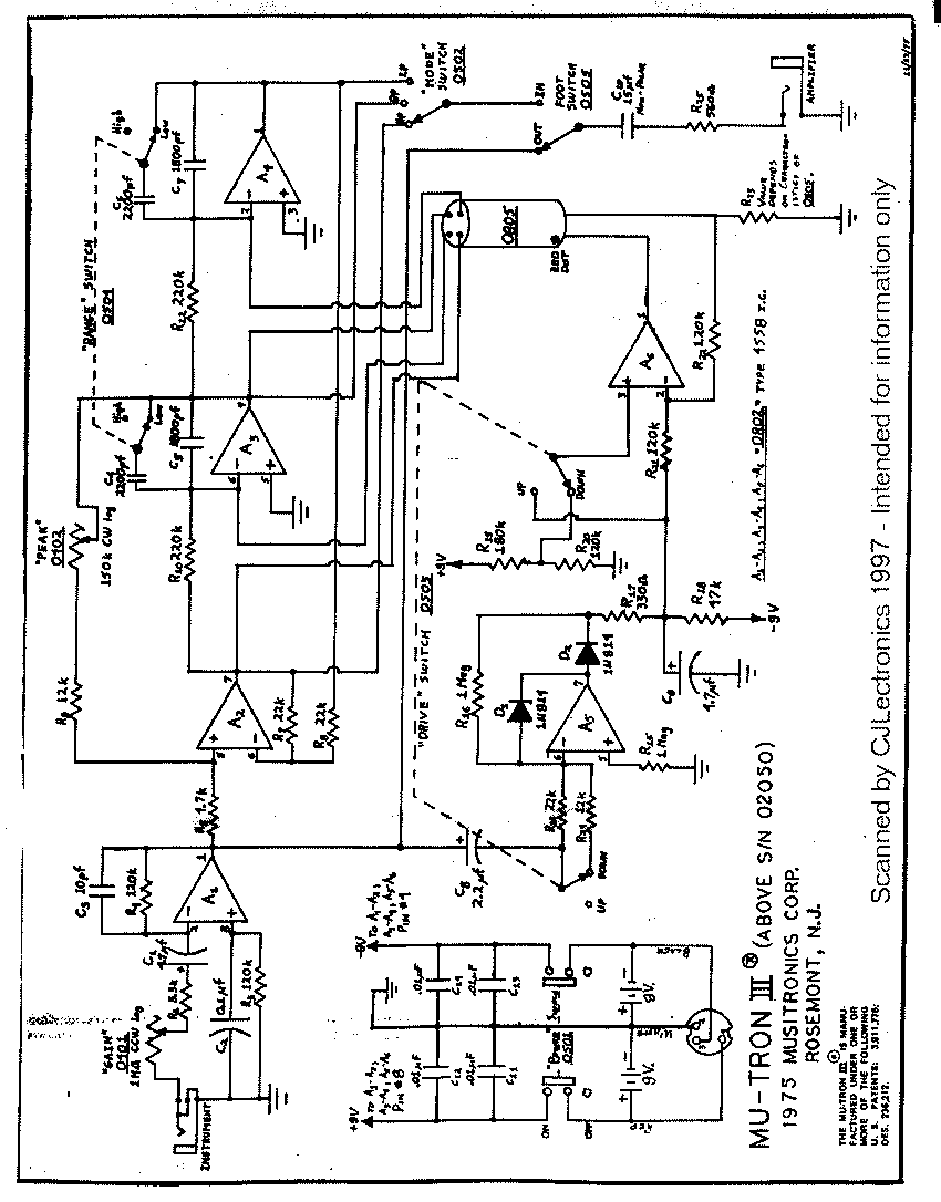 The MutronIII Envelope Filter circuit was developed by Mike Beigel with the help of Steely Dan guitarist Elliot Randall ... The MutronIII circuit is based around a State-Variable filter and a simple but effective envelope detector circuit controlling it through optically controlled resistors - the envelope detector produces a nice flutter in the filter when the sensitivity switch is engaged to high position ... Read all about Elliot and Mike talking about Electronic Controlled Filters ...