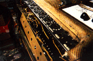 This '65 Fender Twin Reverb Amp came to me with extensive damage ... it had spent years on a yacht I'm told, which explains the considerably rusted OT laminations - but since the tranny proved out to still have great tone I didn't mind having to replace nearly everything around it ... the B+ lies around 460 volts DC ... tubes were Phillips 6L6GCs for a long time - never happy with 6L6's in this amp ... now I have it running on a single pair of KT66-HP's, the whole amp is now wired like the 5F8-A except with one 6G8 resistor value swap in the phase driver for xtra heat, one tone stack is disabled of course, and grid blockers lie on only two power tube sockets ... the reverb is disconnected, I'm not doing the direct-coupled trick in this amp this time ... instead I send a signal to a digital Zoom G1 (for verb/delays only) from the second jack of the channel I plug into with the guitar ... I go straight in with the guitar in jack 1 of one channel (both channels are the same) and then I go out from the second input of that channel to the G1, then out from the G1 to the other channel's input ... this way I get a straight-in (direct) sound plus a very high quality 24bit/96khz verb/delay effect that can be dialed in from the other channel // I find I get way better fidelity overall not having the mixing of signals between dry and wet occuring inside the pedal - going straight into the amp from the pickups seems important to maintain ... the speakers are JF Naylors, 15 years old and still holding fine - fantastic speakers ... overall an amazing amp and setup, my best tone setup for this amp so far ...