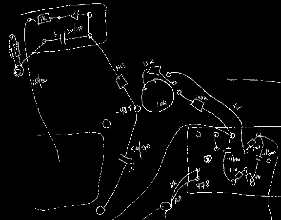 An important point also is the choice for a replacement resistor on the potentiometer divider circuit - here I show a value of 27k-Ohm; this gives a wide enough adjustment range but at times this value may be different depending on the volatge levels of the Power tranny ... check Fender schematics for values and ideas ...