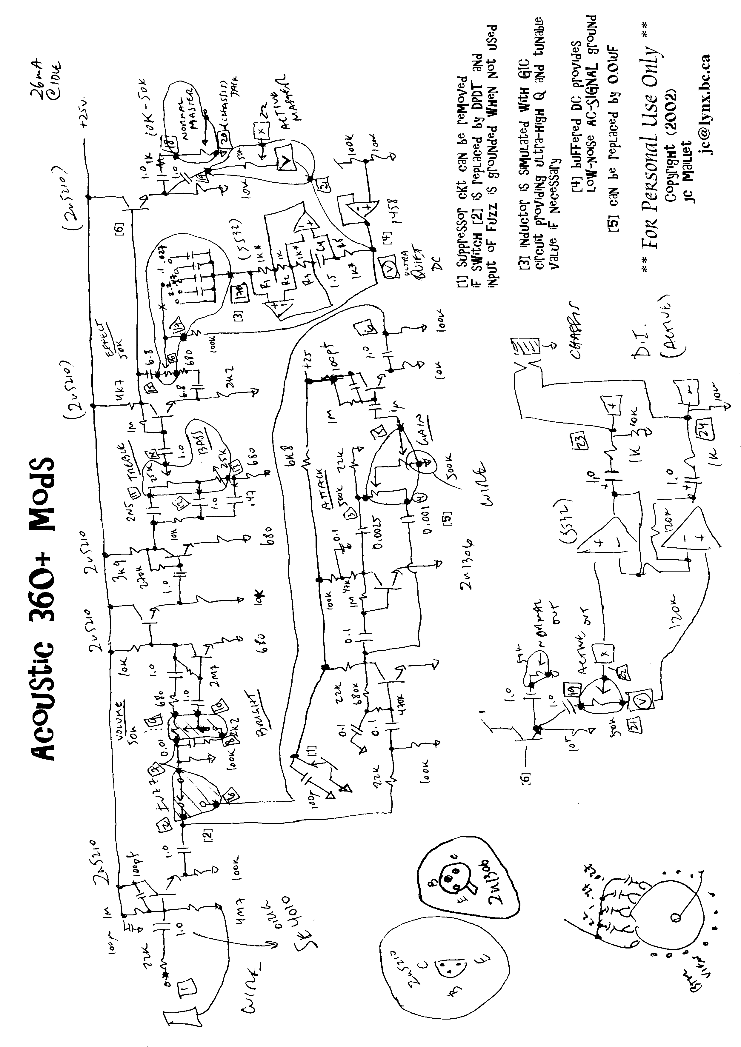 One other question: As best as I can remember, the Acoustic 360 pre-amp did not have a Master Volume control (as shown on your schematic and all other 360 schematics) so I am assuming that this must have been a factory pre-set internal trim-pot (I have not had access to the real deal Acoustic 360 otherwise I would not have these questions). If so, I wonder what it was set at?