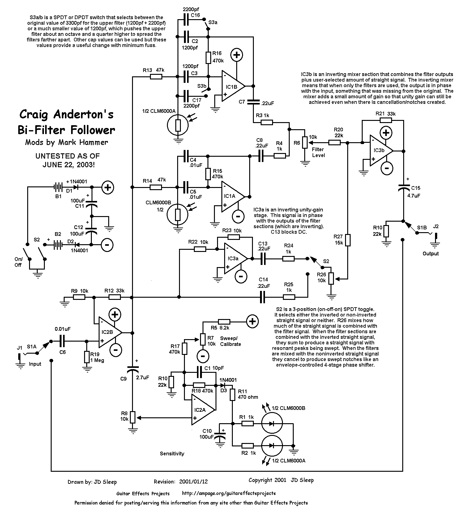 Craig's Bi-Filter circuit consists of a pair of bandpass filters optically driven by an envelope follower circuit ... that is, a parallel combination of hi-band and lo-band filters moving up and down in response to input signal envelope ...