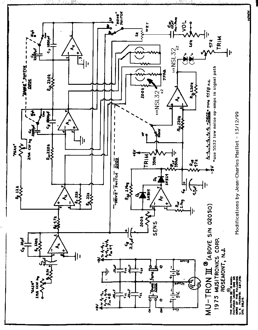 I built my first mutronIII clone in 1996 for local touring/studio player Rob Post who wanted a close replica sounding clone of his vintage pedal, but with rackmount flexibility ... I cloned the PCB board, then used low-noise NE5532 op-amps and a near-equivalent photodiode coupling arrangement on the driver op-amp - actually, a pair of Silonex NSL-32 phtocells acting as one dual-cell ... I'm also using lo-tech 1/2watt carbon comp resistors and Philips signal caps - I was thus able to produce a tonally and functionally identical clone to the original with the added bonus of a less noisy signal-path ...