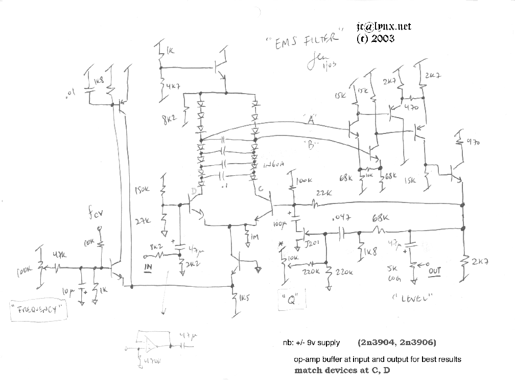 The CV circuit is interfaced by a linear optical V-R converter whence two photo-cells are controlled in balanced unison to set the SV filter ranges ... this optical converter has an offset and gain adjustement as well, similar in function to my Moog filter mod, which results in the filter limits being set arbitrarily and precisely within a "desired" range of action ... [[ Note: in the Moog V-I converter how low the filter can go is fixed by the input bias voltage Vgs(DC) of the second device in the sampler channel - thus making it worth picking through several devices and choosing the one that gives good low-end range ]] ... aside from making the normal S/H sounds, when the State-Variable filter is traversing it's entire range at high speed it sounds like a hand saw blade warble, when it's doing the same in the lower range it can produce a percolating type sound ... the kind of depth/speed extremes I was hoping to find ...